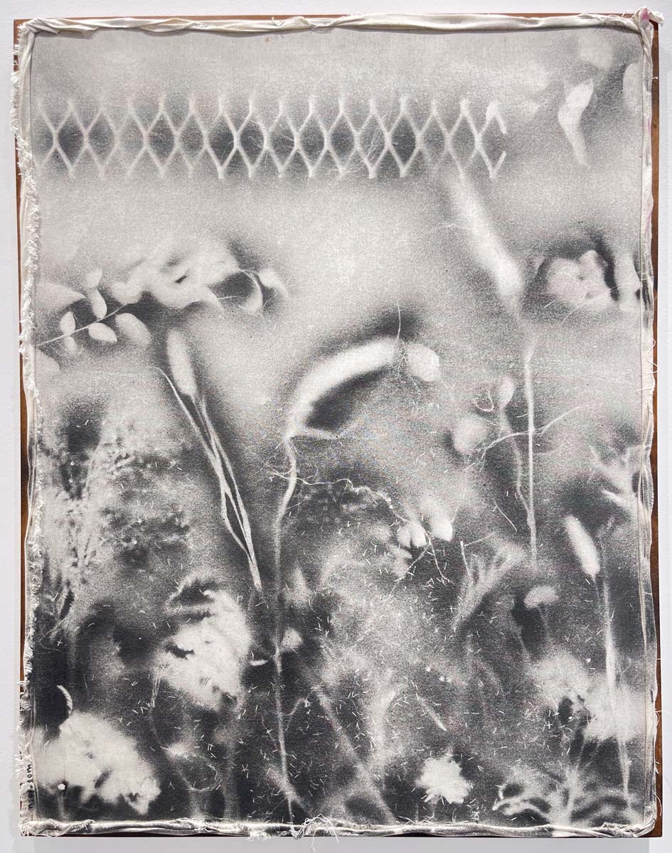 Quant au lieu de dessiner une fleur, un grillage, ou peu importe quel motif, je fais la même chose. Je dépose sur ma toile tous ces objets afin de les « imprimer » à l'aide d'encre projetée.