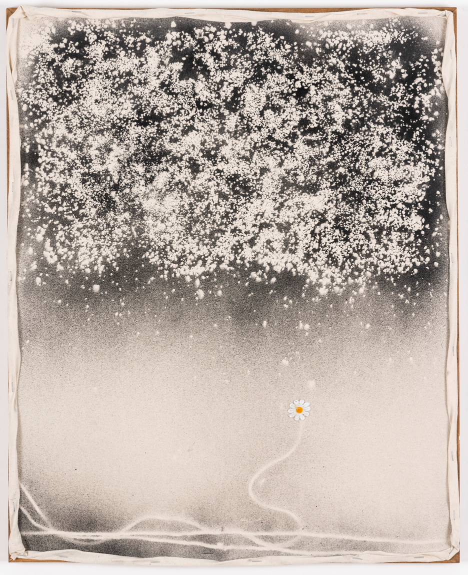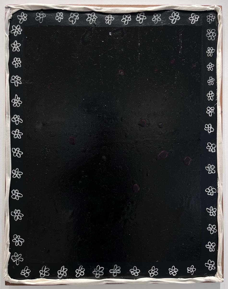 À force de réutiliser les mêmes objets, non seulement ils se transforment, se rigidifient et épaississent sous l'accumulation de couches d'encre, ils changent aussi sur la toile, une fleur peut servir à faire un nuage, sa tige peut devenir un arbre, mais aussi des ombres, ou des formes informelles, ils perdent leur nature originelle, je trouve cette aliénation pertinente car elle me fait penser aux souvenirs déformés par le temps, mais aussi à moi-même, car je crois que nous nous éloignons toujours plus de ce que nous avons pu être étant enfants.