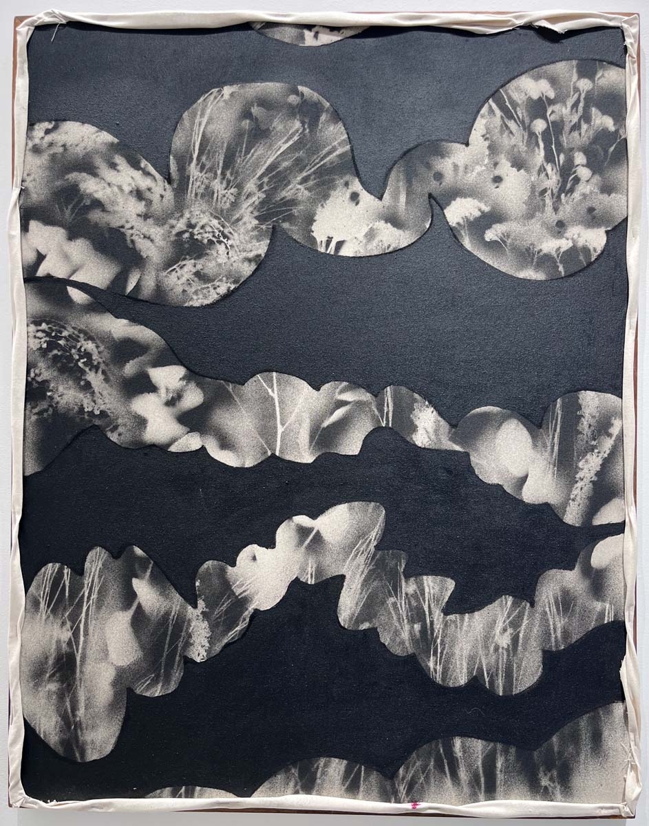 J'ai intuitivement utilisé des objets physiques comme du grillage, du barbelé, des fleurs ou encore de la dentelle, mais aussi du papier toilette mouillé, du sable et tout ce qui peut me servir afin de faire un patchwork de pochoirs.